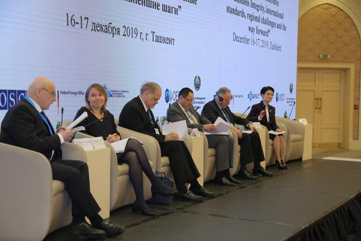 Hans-Ullrich Ihm (l), Senior Project Officer, OSCE Project Co-ordinaor in Uzbekistan, Olga Savran, Manager of the OECD Anti-Corruption Network for Eastern Europe and Central Asia, H.E. Ambassador John MacGregor, OSCE Project Co-ordinator in Uzbekistan, Adkham Ikramov Chairman of the Chamber of Commerce of Uzbekistan, H.E. Ambassador Günter Leo Overfeld, Ambassador of Federal Republic of Germany to Uzbekistan and Svetlana Artikova (r) Deputy Prosecutor General of the Republic of Uzbekistan, welcoming participants of the Conference on Business Integrity, international standards, regional challenges and the way forward in Tashkent, Uzbekistan, 16 December 2019.