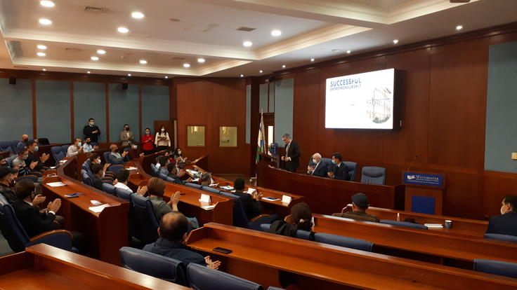 Hans-Ullrich Ihm, OSCE PCUz Senior Project Officer and Nizom Kadyrov, Vice-principal of Westminster University Tashkent, during the certificate award ceremony of the Returned Labour Migrants Training, Tashkent, 30 October 2020.