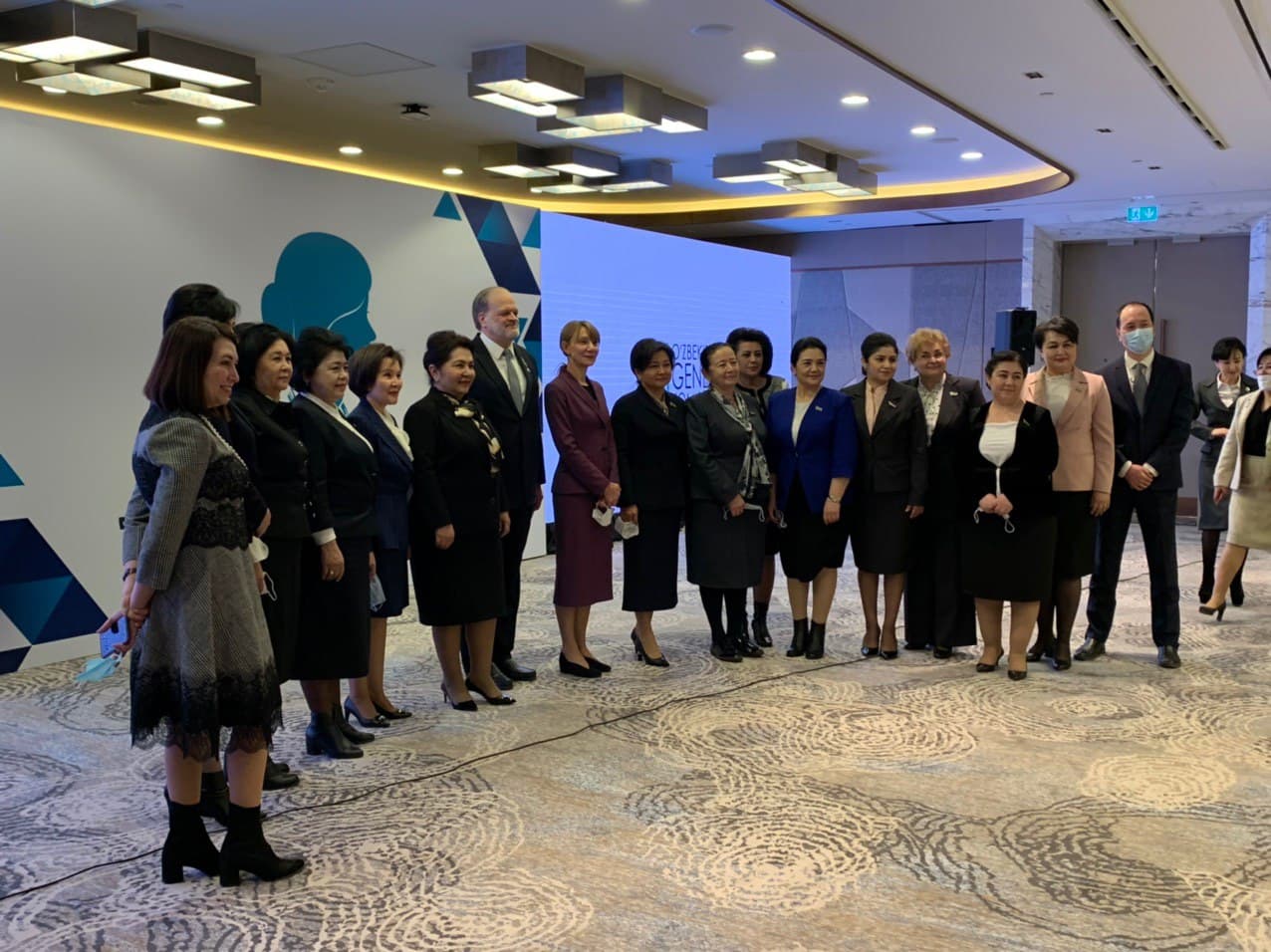 John MacGregor, OSCE Project Co-ordinator in Uzbekistan, Tanzila Narbaeva, Chairperson of the Senate, Matilda Dimovska, UNDP Resident Representative in Uzbekistan, and women parliamentarians during the first Forum on Women Parliamentarians of Uzbekistan, Tashkent, 14 December 2020.