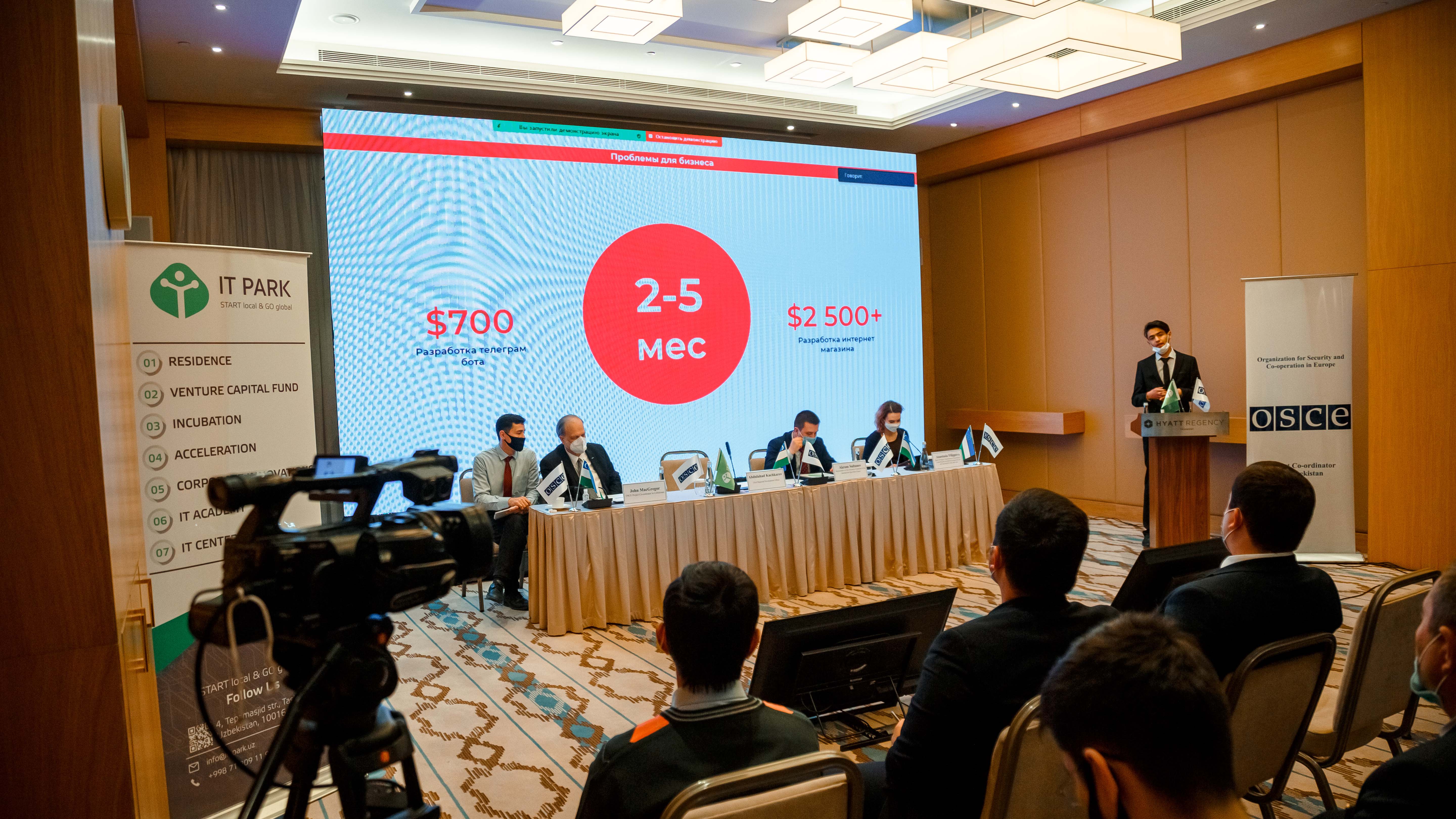 Tairov Maruf, the winner of the hackathon, presenting his project at the seminar on practical relevance and prospects for the development of the open data ecosystem in Uzbekistan, Tashkent, 2 April 2021.