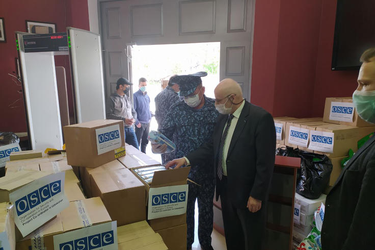 Ханс-Ульрих Им, Старший советник по проектам, участвует в передаче СИЗ от офиса Координатора проектов ОБСЕ в Узбекистане Главному управлению исполнения наказаний МВД Республики Узбекистан 10 апреля 2020г. в Ташкенте.