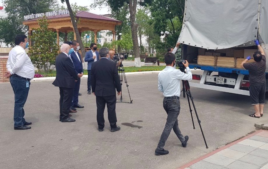 Ro’y bergan to’g’on o’pirilishi oqibatida YXHTning O’zbekistondagi loyihalari koordinatori xodimlari insonparvarlik yordam yukini Sirdaryo viloyatiga yetkazib berishdi, 13 may 2020 yil.
