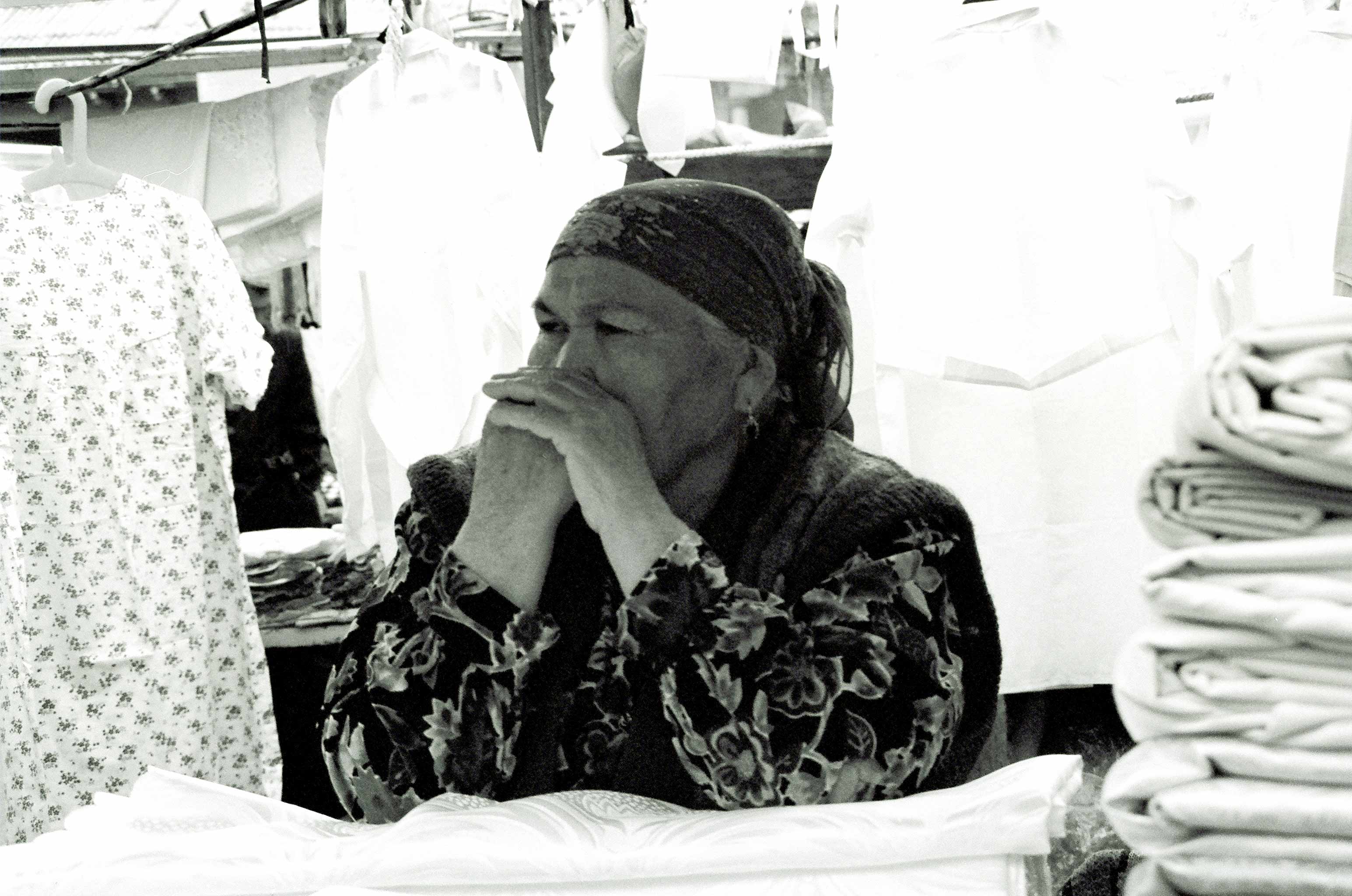 A woman selling cotton fabrics on the central covered market of Tashkent, Uzbekistan, waiting for customers.