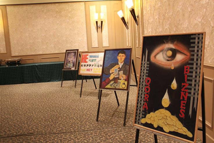Paintings of finalists of the contest on best artistic work highlighting problems of corruption that was held among students of colleges and universities of Uzbekistan, 15 December 2016.